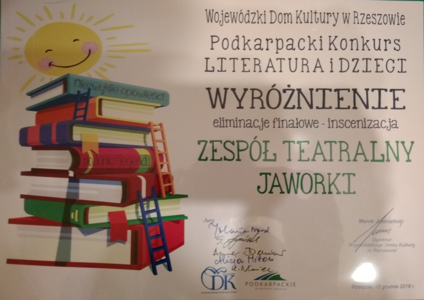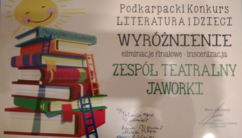 Wczoraj zespół „Jaworki” , na deskach Wojewódzkiego Domu Kultury w Rzeszowie prezentując swoją inscenizację "Bursztynową koronę", opowiedział widzom o losach Mikołajka, który za swoje niegrzeczne zachowanie został ukarany przez Władcę Bałtyku. Król morza zamienił go w mikołajka nadmorskiego, w piękną chronioną roślinę. Uczniowie za swoją prezentację dostali wyróżnienie. Zespół otrzymał dyplom, książkę i zaproszenie na Galę Laureatów, która odbędzie się 17 grudnia 2018 Wojewódzkim Domu Kultury w Rzeszowie.