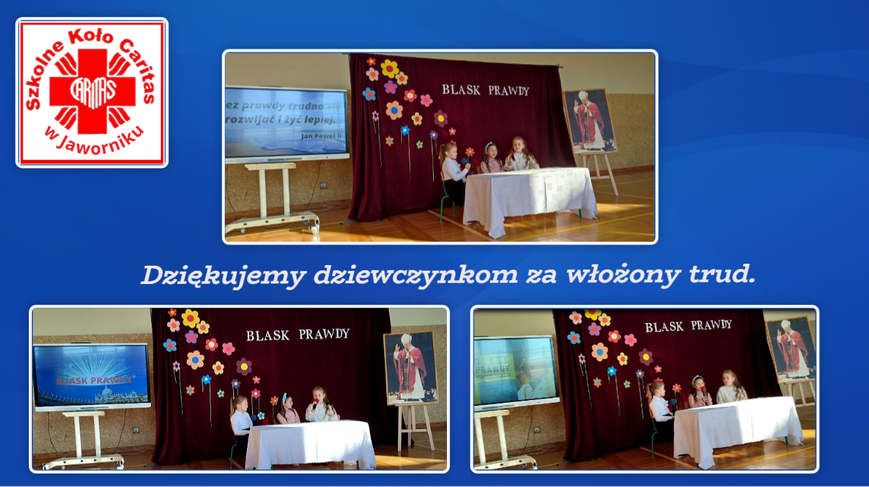 13 października najmłodsze członkinie SKC wprowadziły nas w klimat konkursu i nadchodzącego XXII Dnia Papieskiego, który w tym roku obchodzony będzie w najbliższą niedzielę - 16 października - pod hasłem Blask Prawdy.