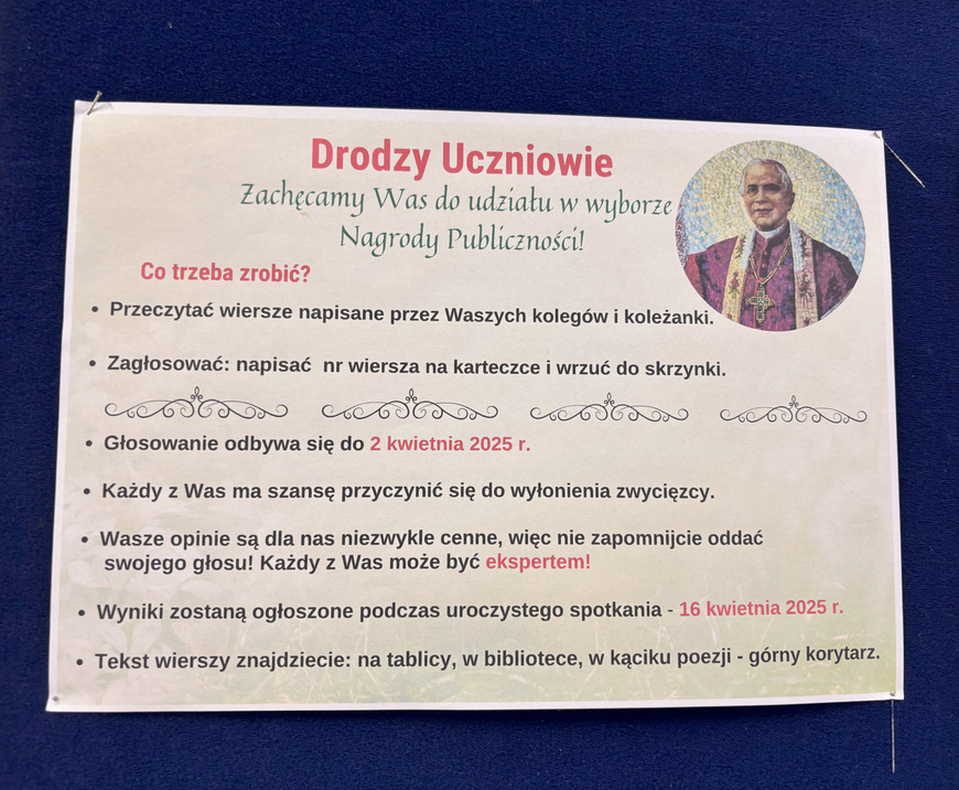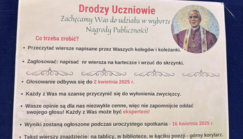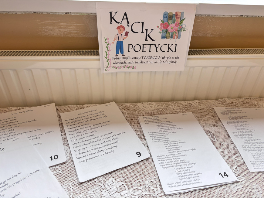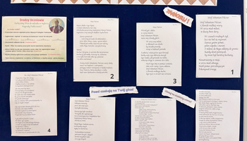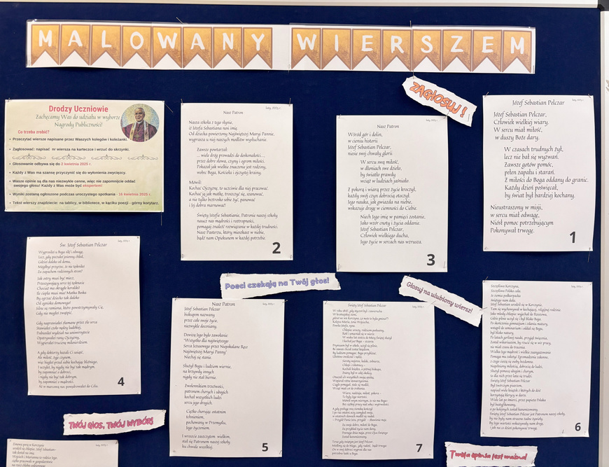 W lutym, bieżącego roku został ogłoszony Rodzinny Konkurs na wiersz o Patronie szkoły. Do konkursu przystąpiło 10 uczniów ze swoimi najbliższymi. Miejscowi poeci ułożyli 11 wierszy o Świętym Józefie Sebastianie Pelczarze. Wiersze zachwycały zarówno swoją długością, jak i głębią treści. Czytając je, możemy wzbogacić swoją wiedzę o Patronie naszej szkoły. Śmiało można powiedzieć, że niektóre z nich przypominają życiorys ujęty w poezji.