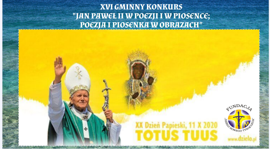 W najbliższą niedzielę, 11 października 2020 roku, obchodzić będziemy XX Dzień Papieski pod hasłem Totus Tuus. Z tej okazji, uczniowie klas 1-3 wzięli udział w Gminnym Konkursie Jan Paweł II w poezji i w piosence, którego organizatorem jest nasza szkoła. W tym roku to konkurs plastyczny - online: Poezja i Piosenka w Obrazach.